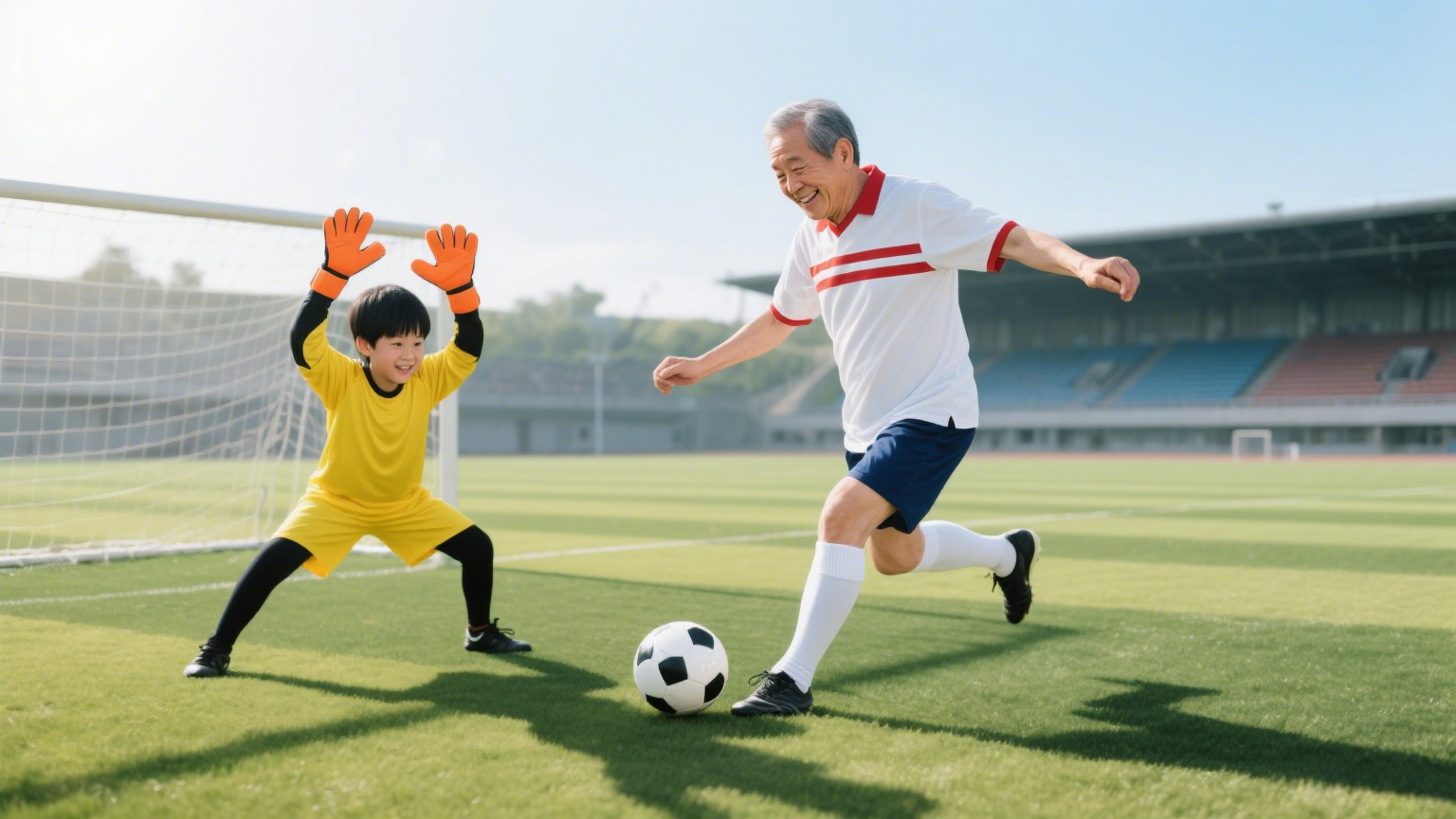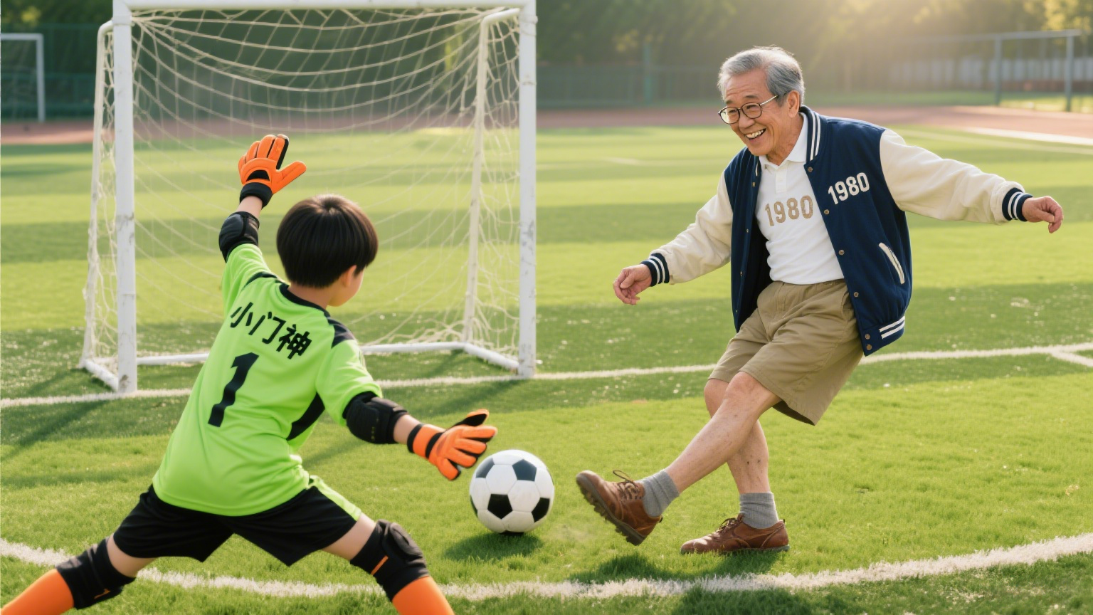 “江宁国资杯”赛场,本是八大国企集团职工队伍竞技的舞台。区关工委敏锐抓住这一契机,主动融入、“借台唱戏”。于是,赛场上出现了独特的风景线:当父辈们在场上拼搏时,爷爷们带着孙辈组成啦啦队。比赛间隙,绿茵场变身欢乐的亲情乐园。在关工委工作人员的引导下,一场场即兴的“爷孙点球大战”激情上演:爷爷们或稳健、或略显笨拙地起脚,孩子们则紧张地守门,有时还化身“小教练”一本正经地指导“脚法要这样踢”!活动巧妙引导青少年在暑期动起来、乐起来,促进代际交流。足球在这里超越了竞技,成为亲情升温、活力传递的温馨纽带。这充满童趣与亲情的场景,为青少年暑期生活增添了别样色彩。