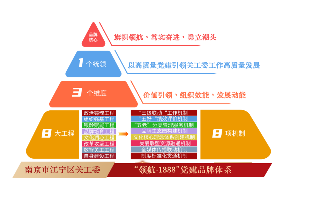 一个统领即“党建带关建”,这是江宁区关工委品牌体系的第一个维度:价值引领。以新时代党的建设总要求为根本遵循,将关工委工作全面融入全区党建工作总体布局,实现同规划、同推进、同考核,以高质量党建引领关工委工作高质量发展。“关心下一代工作必须坚持党的领导,这是我们的根和魂。”江宁区关工委常务副主任丁圣荣介绍,“领航·1388”品牌以“旗帜领航、笃实奋进、勇立潮头”为核心定位,将习近平新时代中国特色社会主义思想贯穿始终,锚定“为党育人、为国育才”根本目标,创新构建三级联动、“五共”机制,确保“区-街-社区”各级关工委组织共建、队伍共育、资源共享、活动共联、成效共评,实现“立德树人”的根本任务与党建工作同频共振。