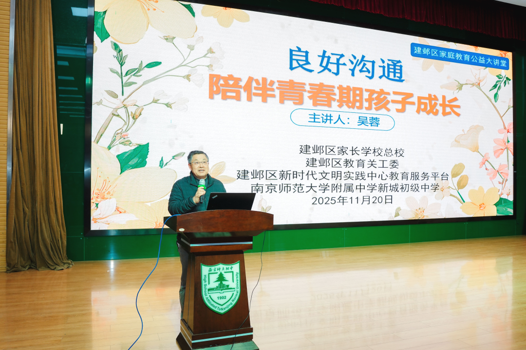 青春期是孩子成长的关键转折期,生理与心理的双重蜕变不仅让他们充满探索欲,也容易陷入困惑,同时给亲子关系带来全新挑战。近日,建邺区“教联体”多方力量协同发力——由建邺区教育系统关工委、建邺区家长学校总校联合主办,建邺区新时代文明实践中心教育服务平台提供支持,南京师范大学附属中学新城初级中学承办的家长学校专题讲座如期开讲。本次讲座特邀南京市心理学科带头人、资深教育专家吴蓉老师主讲,她以《良好沟通,陪伴青春期孩子成长》为主题,为初一年级家长带来了一场既具理论深度又富实践温度的亲子沟通指导课。本次讲座由建邺区教育系统关工委常务副主任唐德海主持。