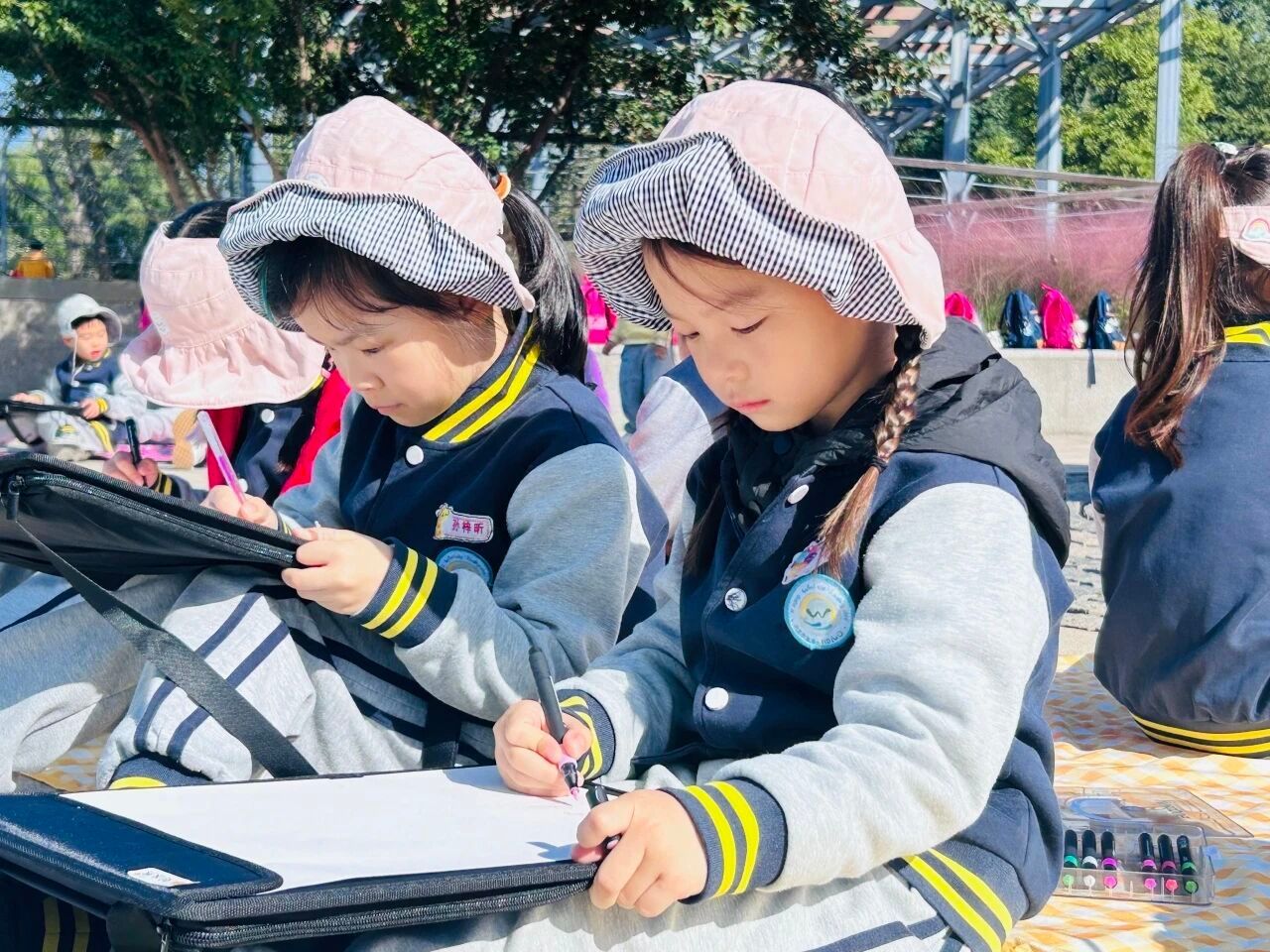 秋光漫江洲,写生映画忙。大班幼儿化身 “小小艺术家”,在江边与花田间定格秋日诗意。彩虹班小朋友围坐粉黛花田旁,细观花穗纹理、叠涂深浅粉韵,让花田温柔在纸上舒展;爱心班则聚焦江堤,笔尖勾勒大桥线条、晕染江面波光,将江水与大桥的开阔装进 “秋日江景图”,艺术种子在自然中悄然发芽。