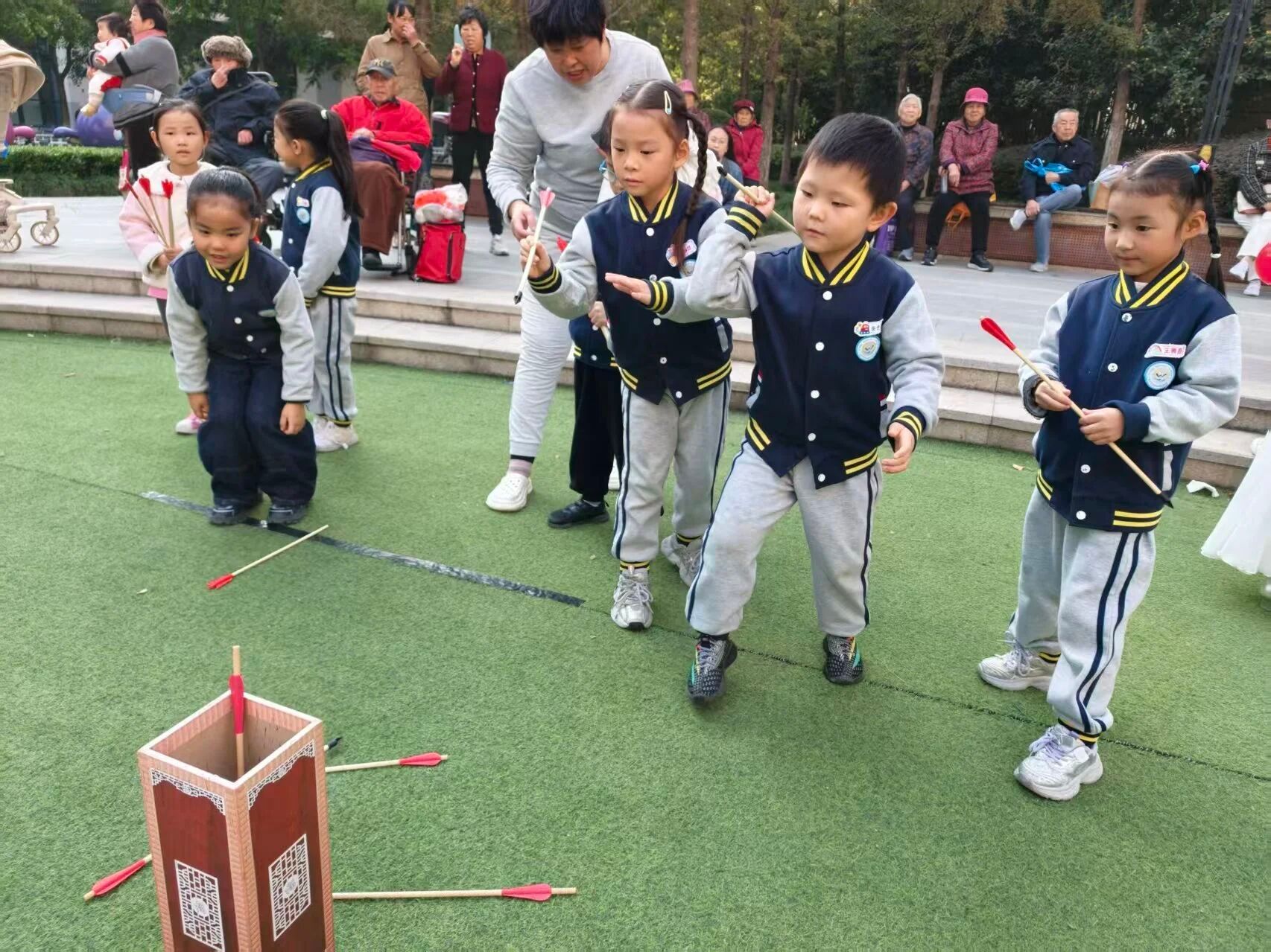 活动现场,大班幼儿带着满满心意,为社区爷爷奶奶唱响歌曲《国家》。稚嫩的嗓音饱含真挚情感,用歌声传递 “福寿安康、笑口常开” 的节日祝福,让长辈们在温情旋律中感受孩童的心意。此外,社区组织了投壶、抖空竹、葫芦彩绘、漆扇描摹等趣味活动。幼儿与长辈小手牵大手,在互动中传承文化,定格温馨瞬间。