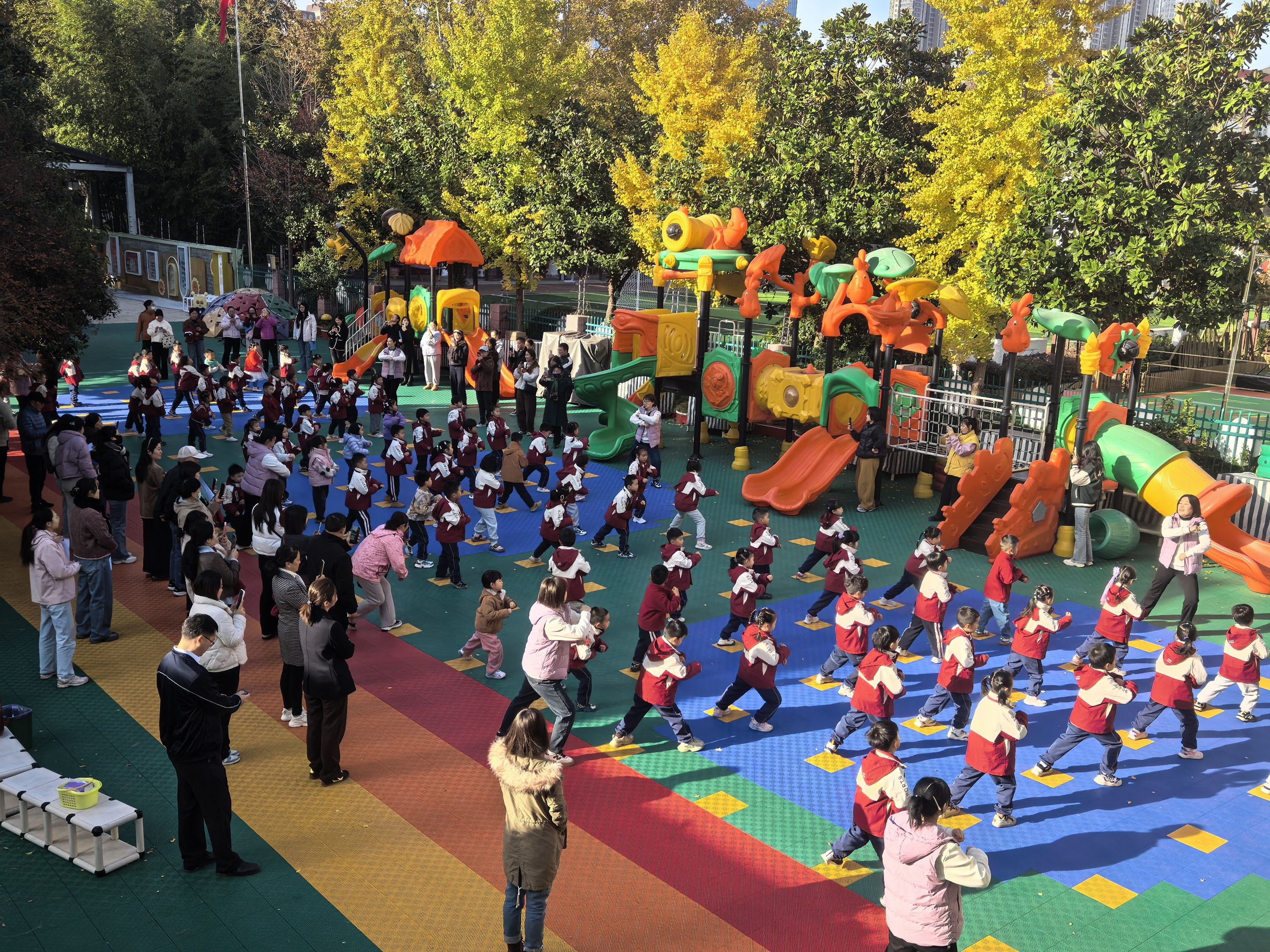 早操环节,孩子们化身为精神抖擞的小士兵,在音乐中展现合拍的动作和整齐的队形。家长们不仅用镜头记录这可爱瞬间,更在老师邀请下走进场地,与孩子共舞,亲身体验晨间活力。