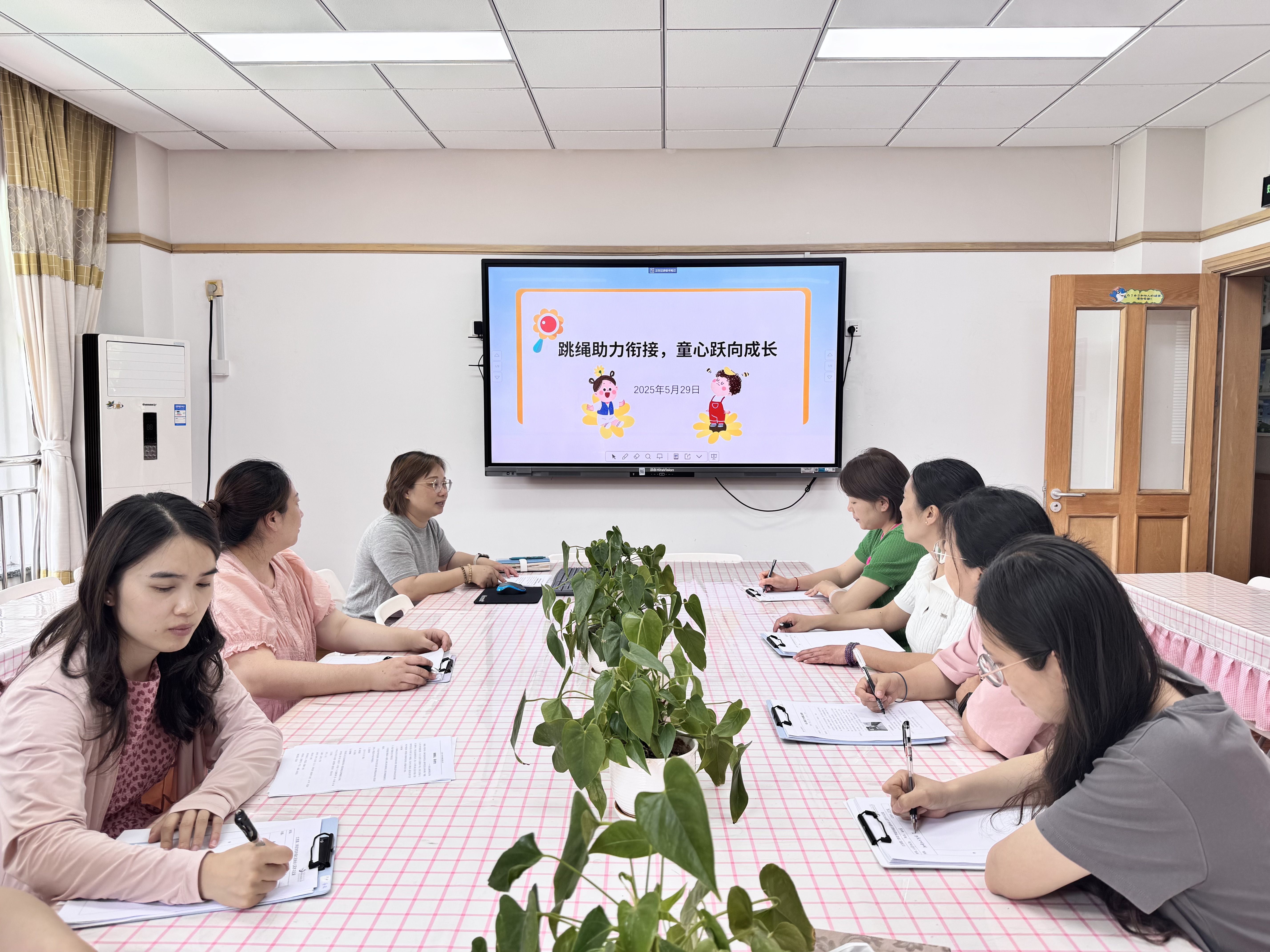 活动伊始,大班年级组长谢老师向大家简单介绍了大班即将开展的“趣味跳绳”游戏活动的目标和流程安排等。紧接着,大班各班教师简单介绍了本班幼儿的跳绳情况,重点讲述了幼儿身体素质和团队合作等方面的变化。最后,根据幼儿实际情况,保教主任俞老师带领老师们头脑风暴,一起就方案的细节进行了补充。保教主任俞老师首先分析了幼小衔接阶段幼儿身体素质培养的重要性,同时结合跳绳活动,讲解其对幼儿身体协调性、耐力、节奏感等方面发展的促进作用。而后,俞老师还向老师们分享了跳绳活动在培养幼儿团队合作意识、竞争意识和坚持精神等方面的具体做法。同时引导老师们一起探讨如何将这些品质迁移到幼小衔接过程中。结合大班各班老师们的经验和做法,小中班年级组老师也分享了自己对在日常活动中如何协同推进跳绳活动的想法。