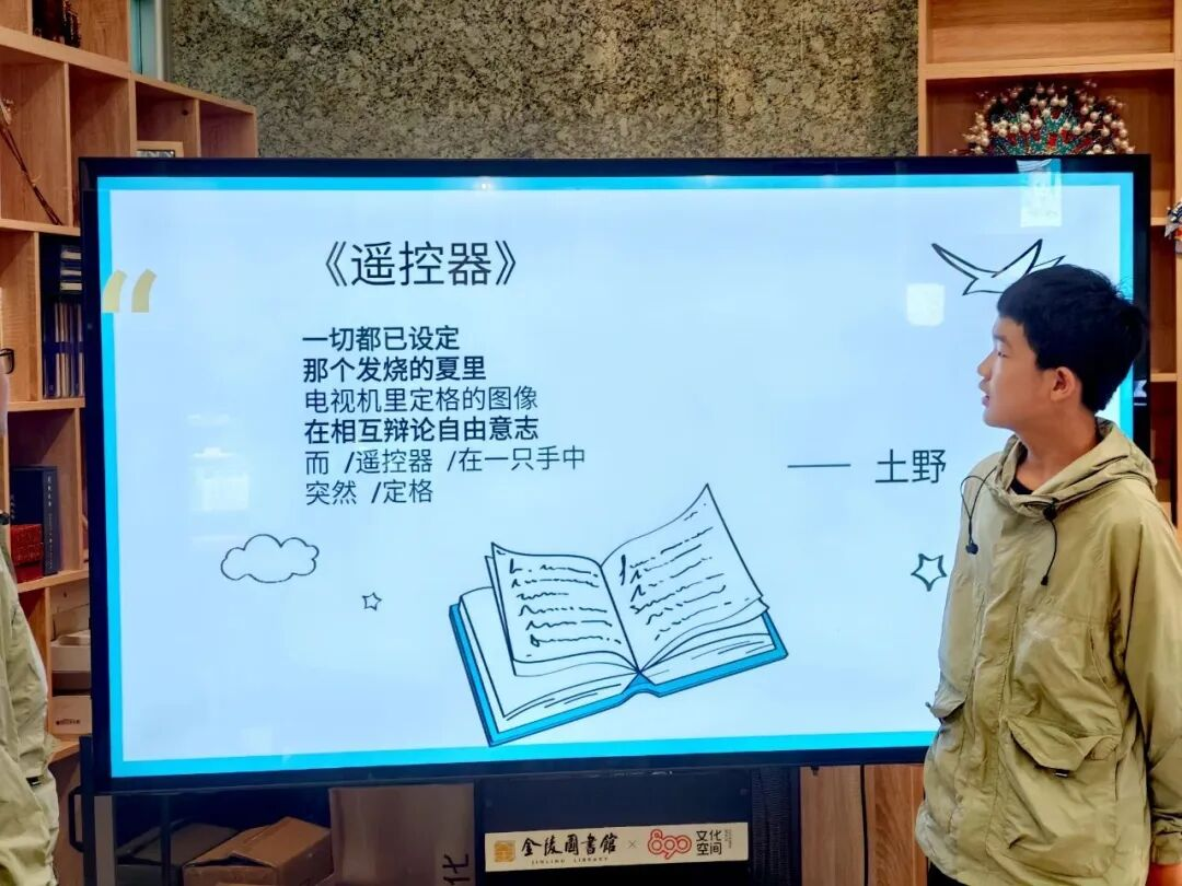 在温馨的趣味共读环节,张明带来了一个特别的分享——她十七岁的儿子、少年诗人土野的诗集作品《克莱因色的海》。