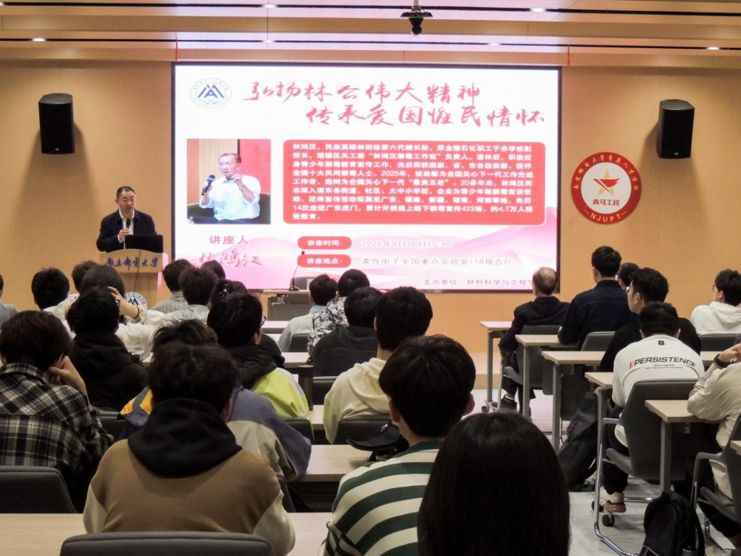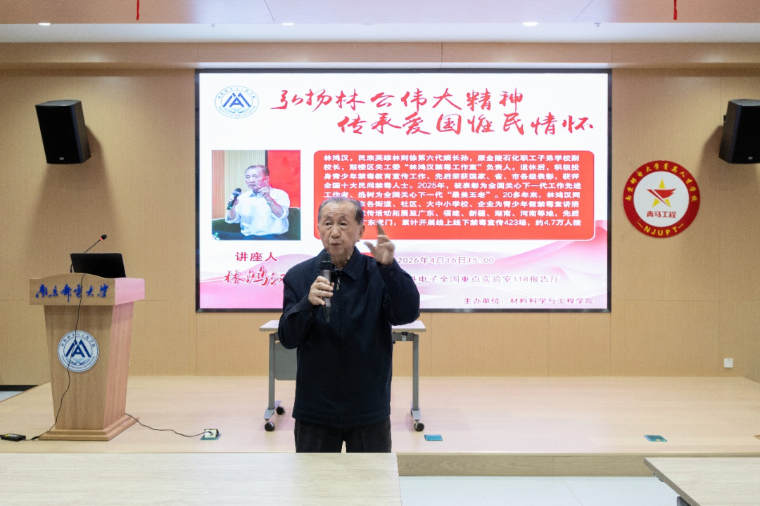 为深入传承林则徐的爱国精神与为民情怀,大力弘扬红色基因与民族精神,扎实推进爱国主义教育与禁毒法治宣传教育,2026年4月16日下午,南京邮电大学材料科学与工程学院特邀全国关心下一代“最美五老”、鼓楼区关工委“林鸿汉禁毒工作室”负责人、民族英雄林则徐第六代嫡长孙林鸿汉老师作专题讲座,题为“弘扬林公伟大精神,传承爱国惟民情怀”。讲座由学院党委书记高志华同志主持。