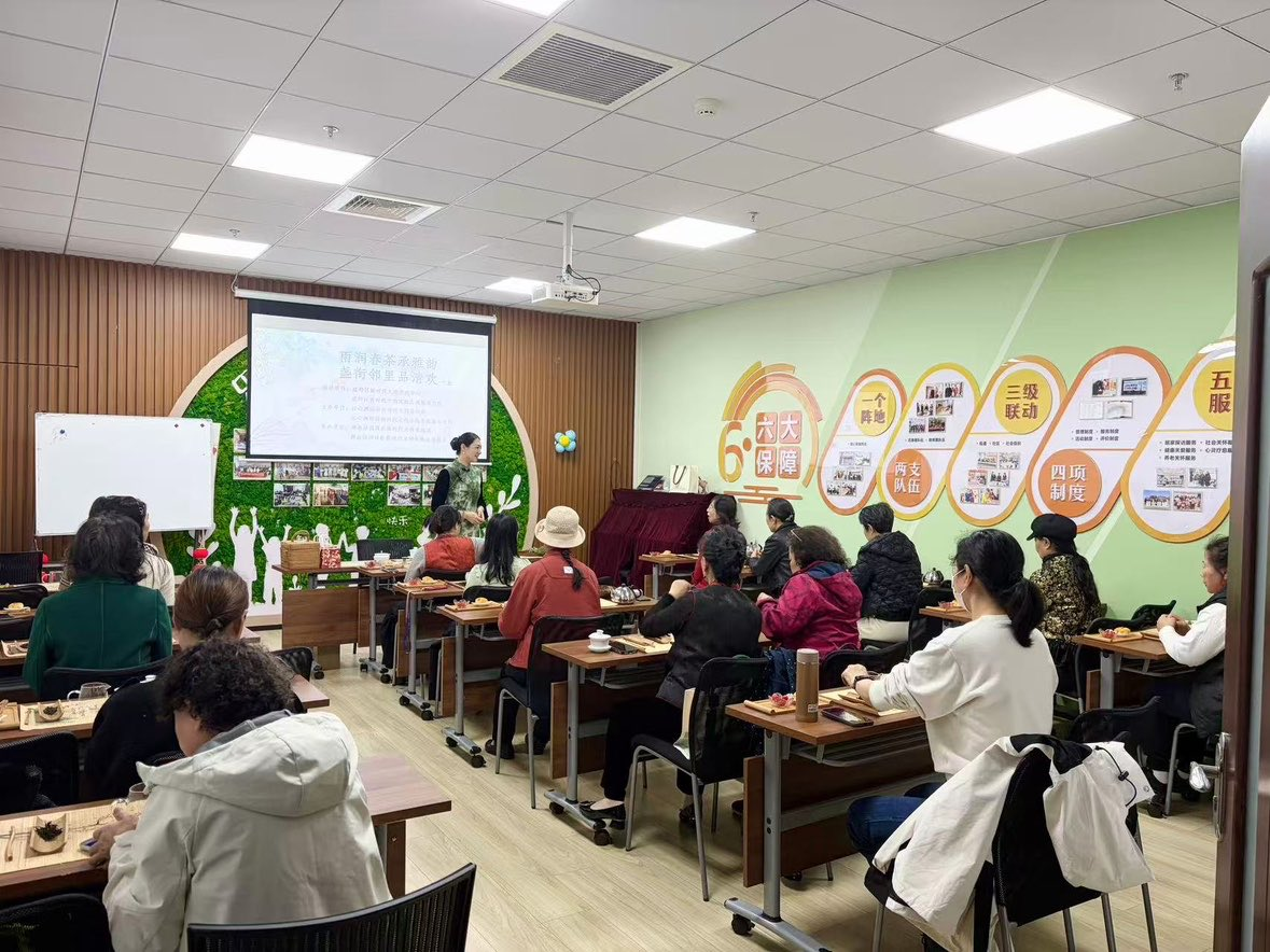 活动现场茶香氤氲、雅致温馨。讲师围绕谷雨节气与茶文化渊源,细致讲解谷雨茶的生长特点、品质优势与品鉴方法,普及盖碗茶的历史脉络、器具结构与冲泡礼仪,将节气习俗与传统茶艺有机结合,引导居民沉浸式感受中华茶文化的深厚底蕴。讲解中穿插互动问答,大家认真聆听、踊跃参与,在轻松氛围中加深对传统文化的理解。