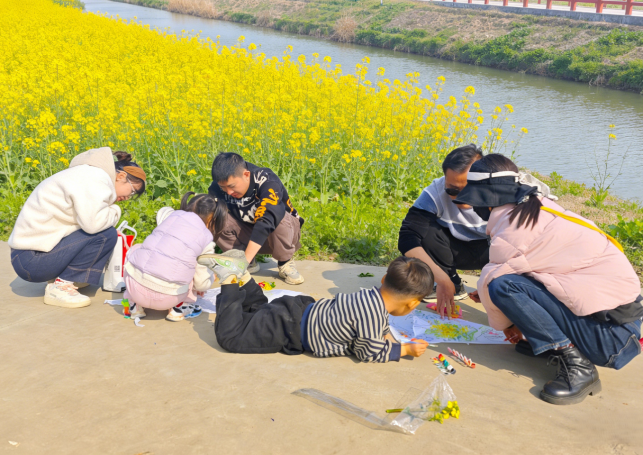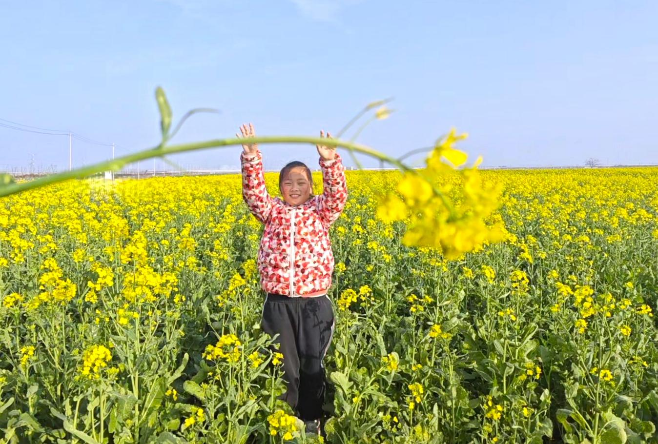 活动的最后,孩子们在金黄的油菜花田里打卡拍照。头顶是湛蓝的天空,身后是灿烂的花海,镜头里是一张张可爱的笑脸。这片油菜花田,随手一拍都是大片。