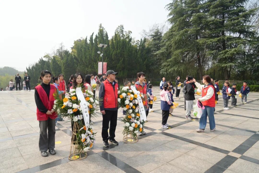 在求雨山革命烈士纪念碑前,孩子们整齐肃立,聆听英雄事迹,亲手献上自制白花,深切缅怀革命先烈。