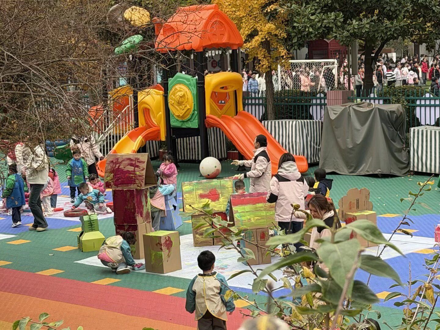 在涂鸦区里,孩子们正用色彩编织秋日童话。纸板房子旁,小“设计师”们认真地为门窗添彩,画上星星屋顶和温暖墙壁;地面涂鸦区里,孩子们或用喷壶为大树“喷洒”上斑斓的树叶,或用小手在金灿灿的银杏叶旁印下一个个童真的印记;保鲜膜胶布区变成了光影实验室,孩子们将捡来的银杏叶、枫叶与彩色胶带结合,创作出会发光的自然画;画板前,每个孩子都沉浸在自己的色彩世界中,而在废旧材料区,旧轮胎、纸箱在孩子们的创意下焕发新生。