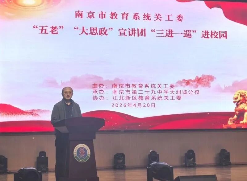 4月20日,在南京解放77周年前夕,南京市教育系统关工委“五老”助力“大思政”主题宣讲活动在二十九中天润城分校中学部举行,拉开了2026年全市教育系统关工委“三进一巡”的序幕。
